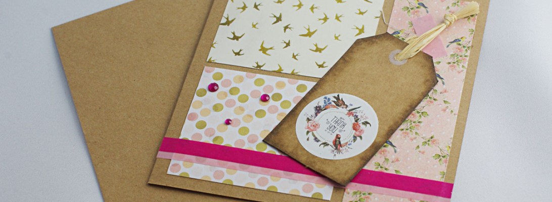 Petit passage éclair pour vous montrer une carte que je pourrais certainement classer dans le style Shabby Chic – si j’aimais les cases ^^. Il s’agit d’une carte de remerciements offerte à une personne qui a eu une gentille attention pour moi. Comme je sais qu’elle est sensible au fait-main, j’y ai vu une occasion de lui faire plaisir également.